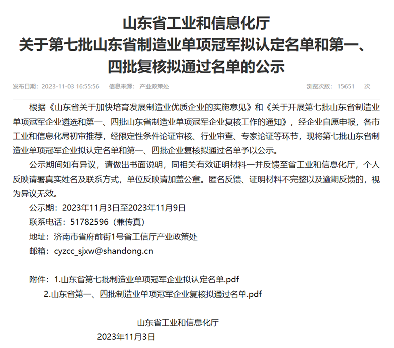 山東省工業和信息化廳關于第七批山東省制造業單項冠軍擬認定名單和第一、四批復核擬通過名單的公示