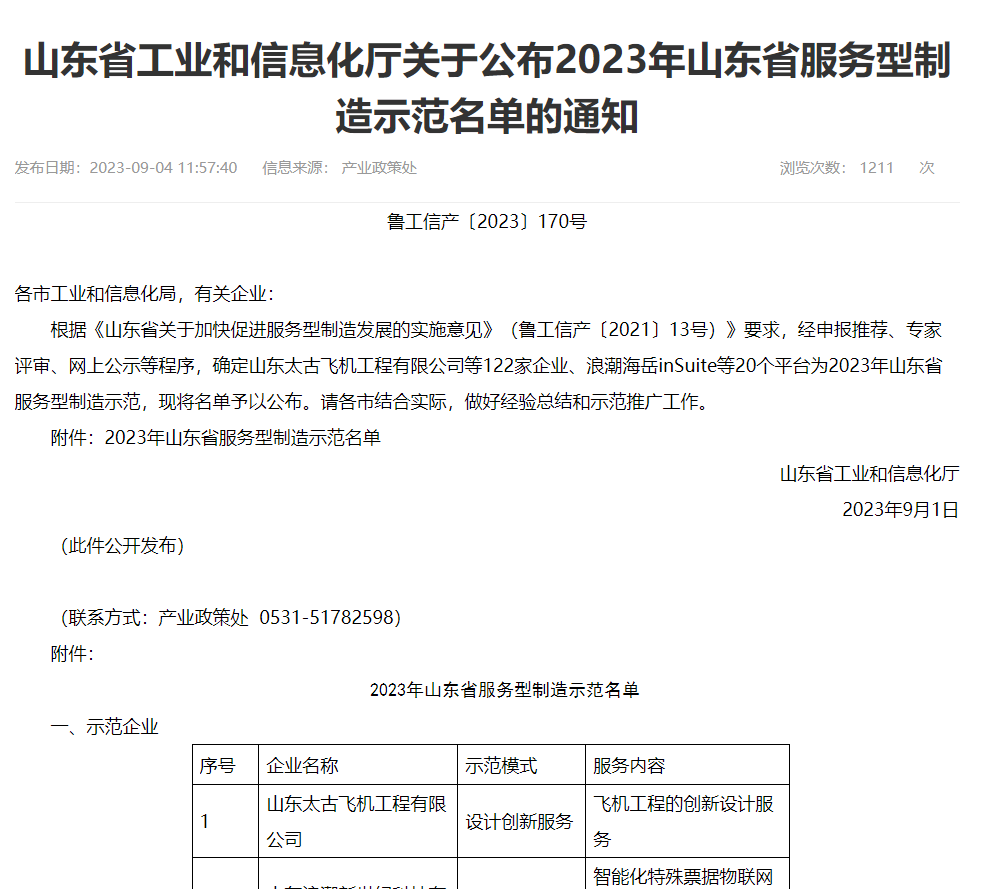 山東省工業和信息化廳關于公布2023年山東省服務型制造示范名單的通知