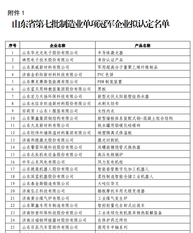 山東省工業和信息化廳關于第七批山東省制造業單項冠軍擬認定名單和第一、四批復核擬通過名單的公示